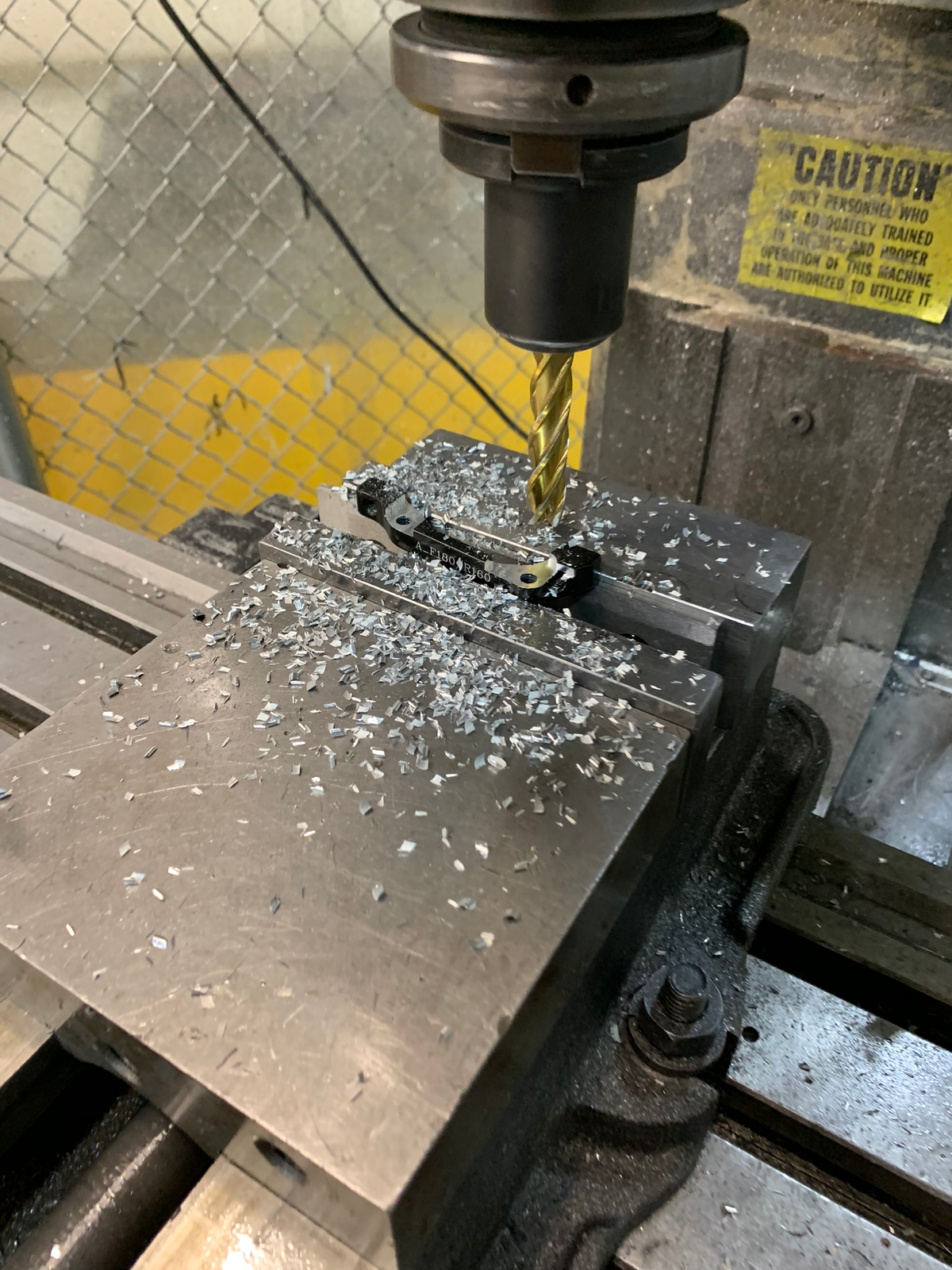 Fig. 3: Machining disc brake caliper bracket as the hub was significantly wider than the original hub. Milling down bolt attach points enabled me to move the caliper 0.15" outwards from the center plane.