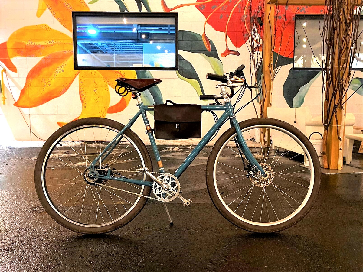 Fig. 2: Completed wheel on truing stand in the Skul space in Artisan’s Asylum, double cross spoke pattern