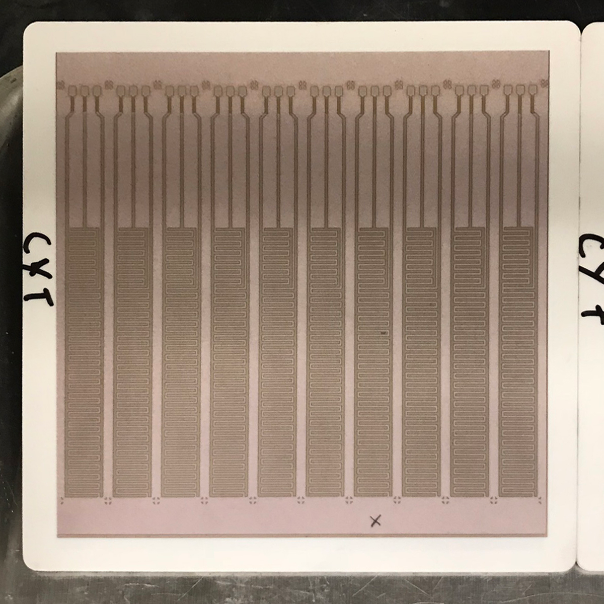 Fig. 4: Completed substrate with Inter Digitated Capacitative (IDC) electrode pattern visible through glass.