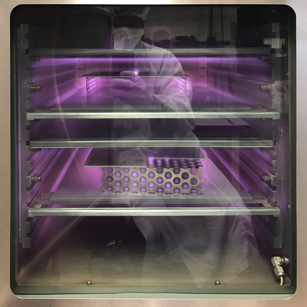 Fig. 2: Reflection of me in front of a plasma cleaner (corona treatment), many hours were spent here dialing in the process. Plasma cleaner used to prepare glass surface for silane deposition, amongst other needs that required increase surface energy.